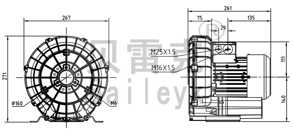 最大風量:100m3/h 最大正壓:120mbar 最大負壓:110mbar 防護等級:IP55 噪音:55db 重量:11Kg